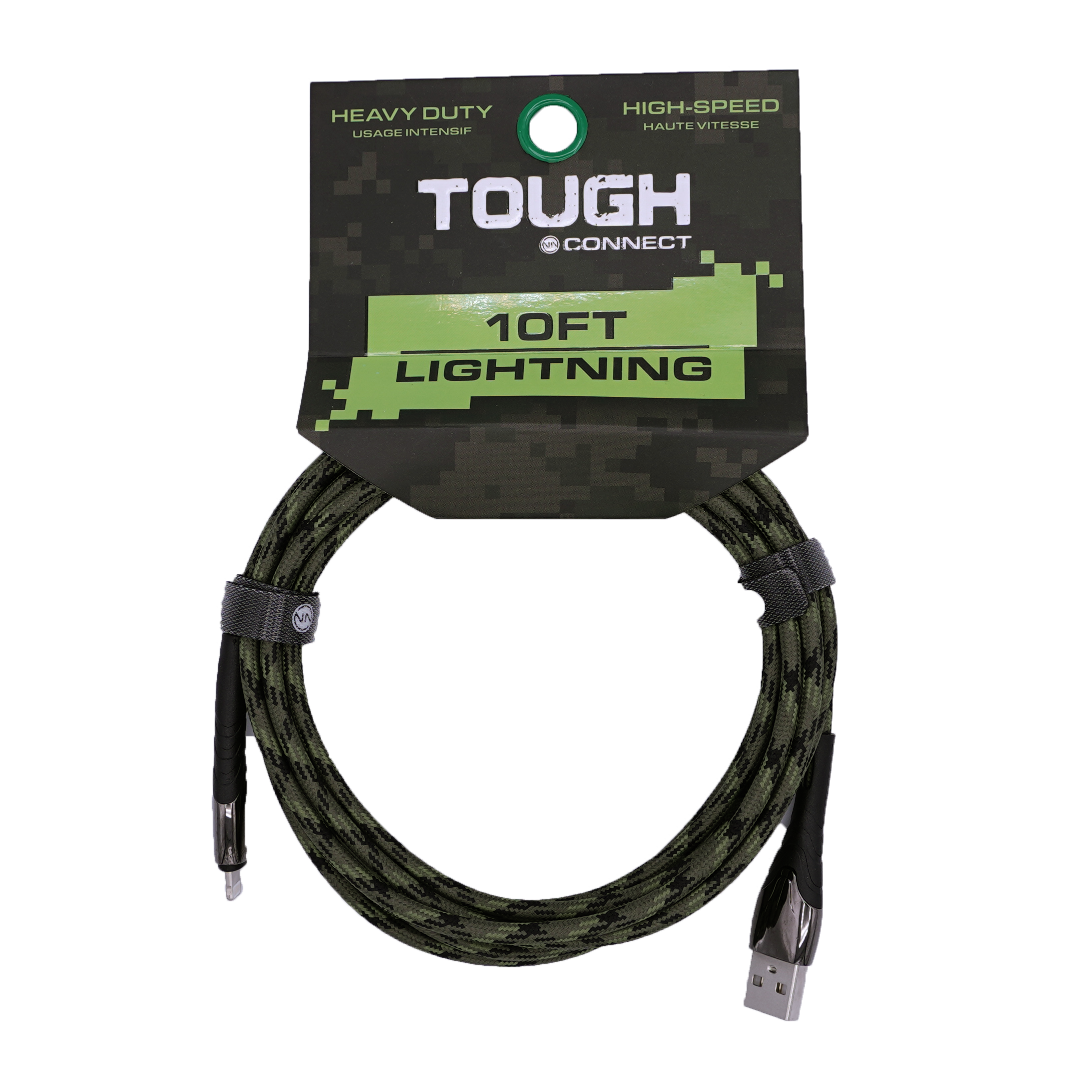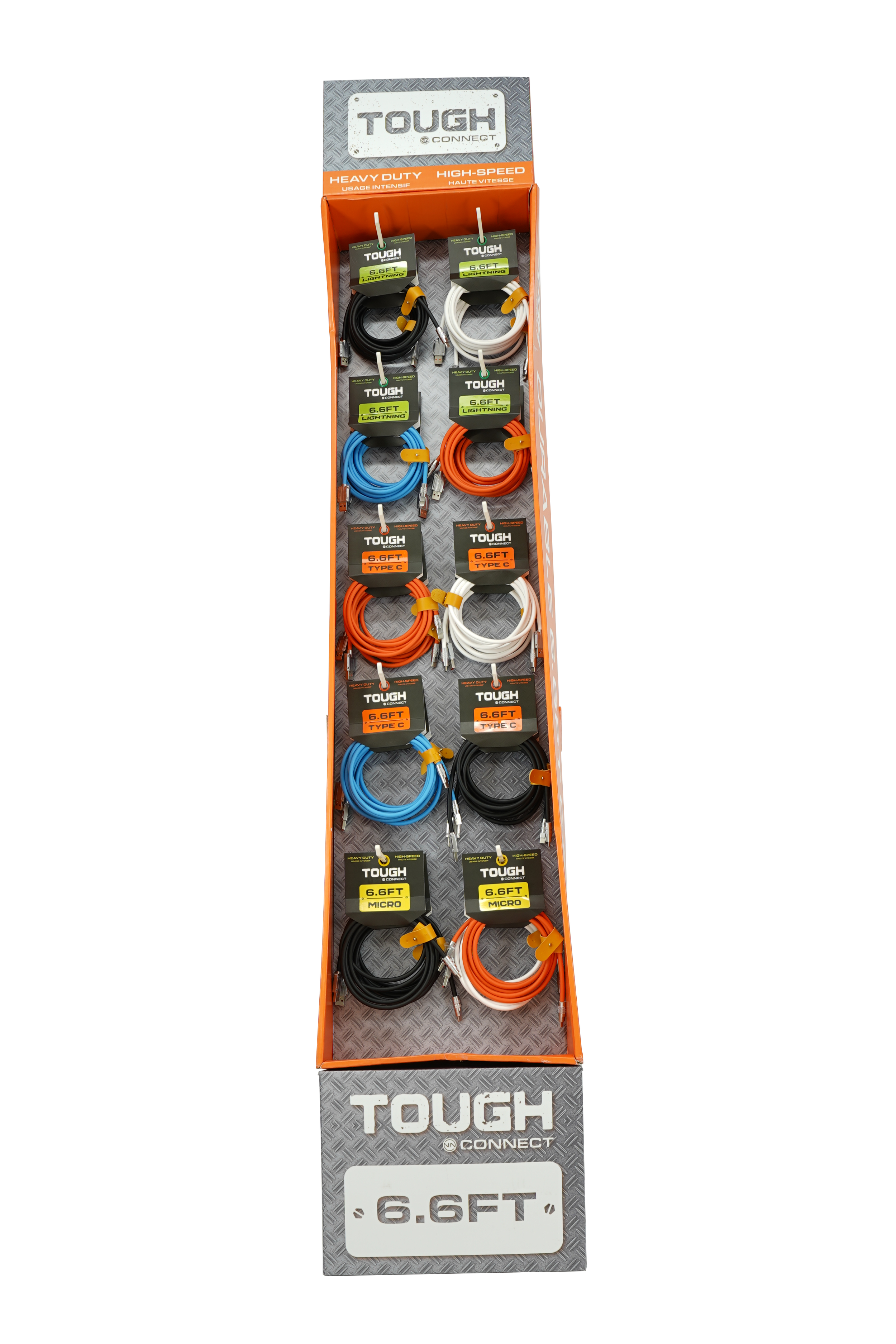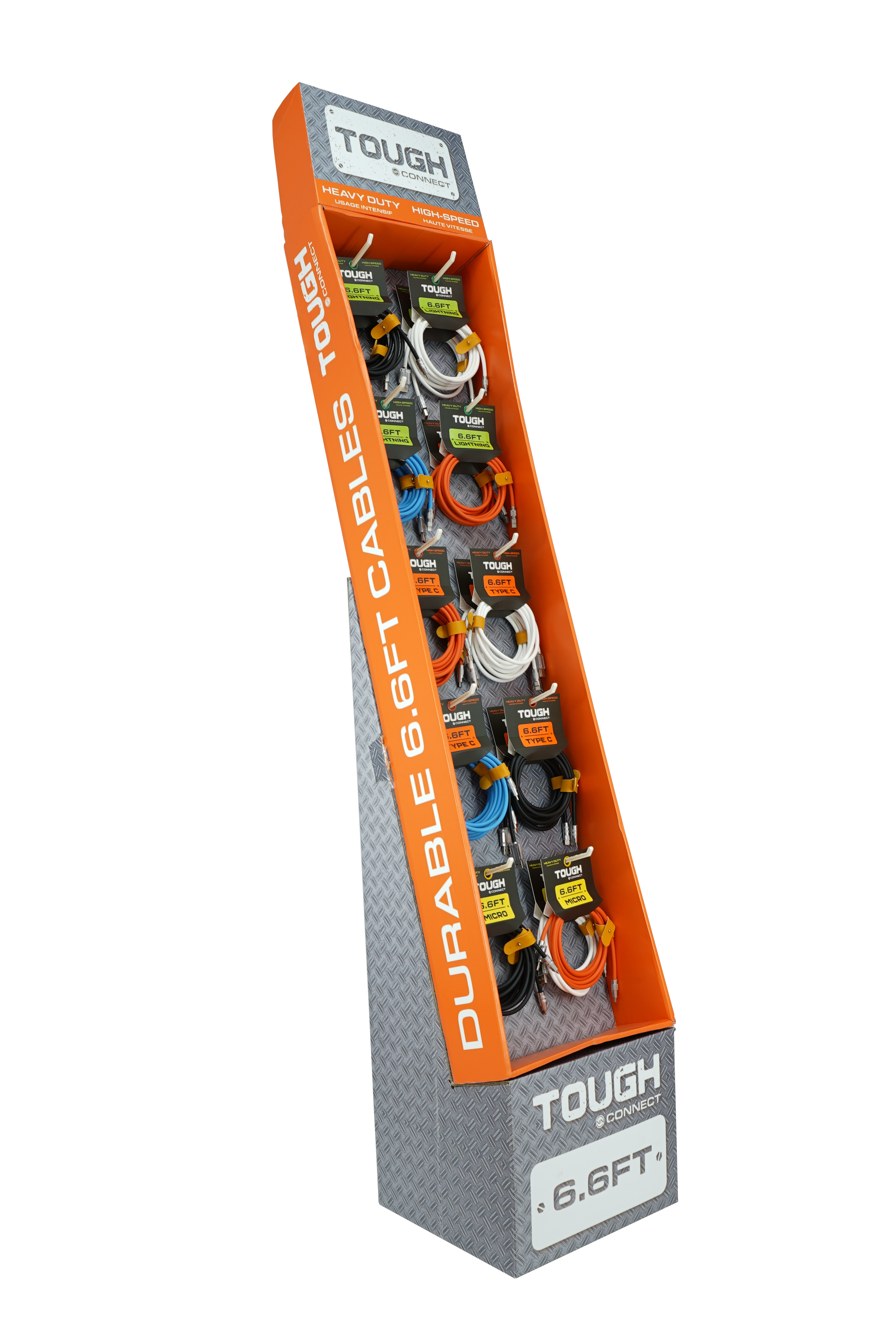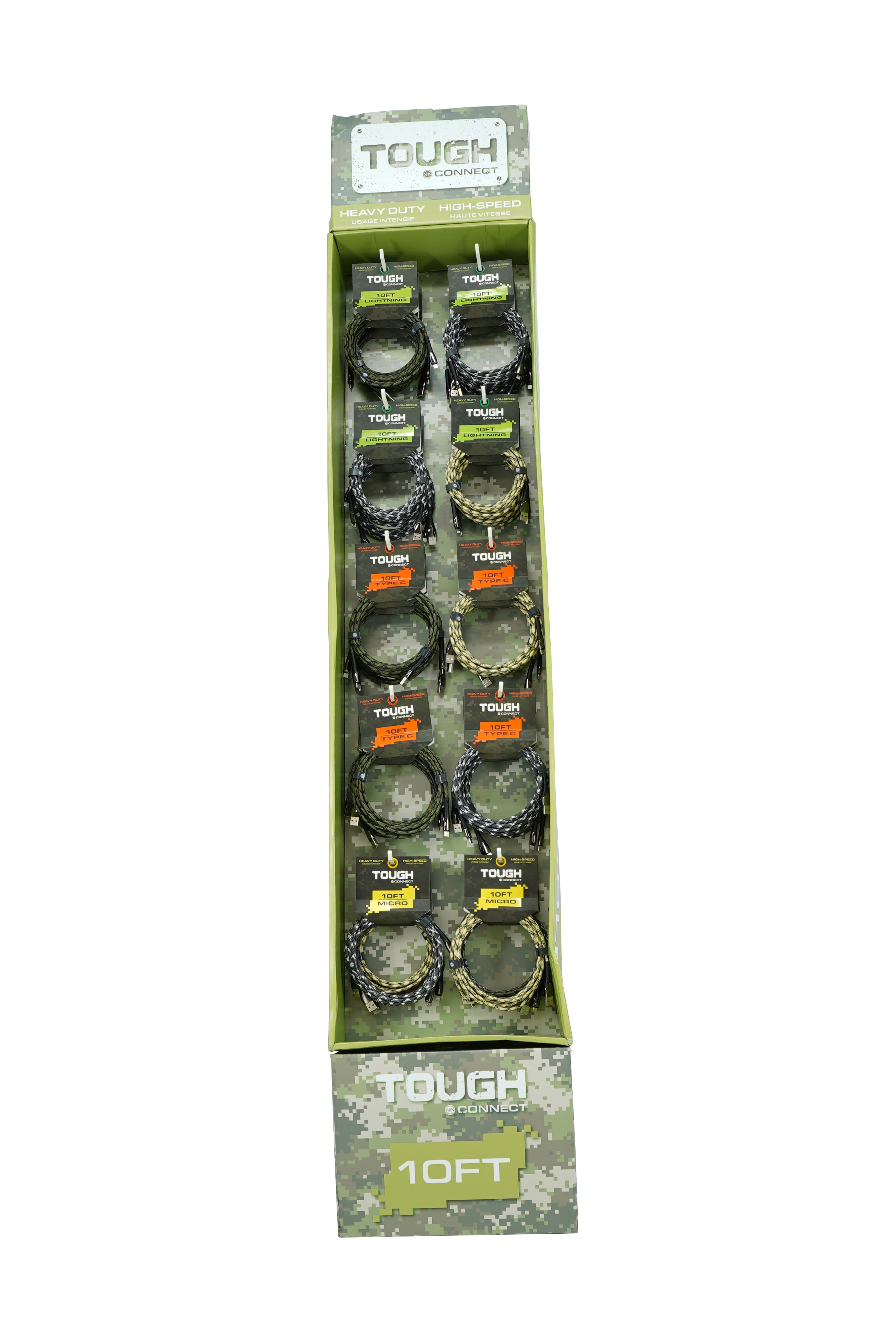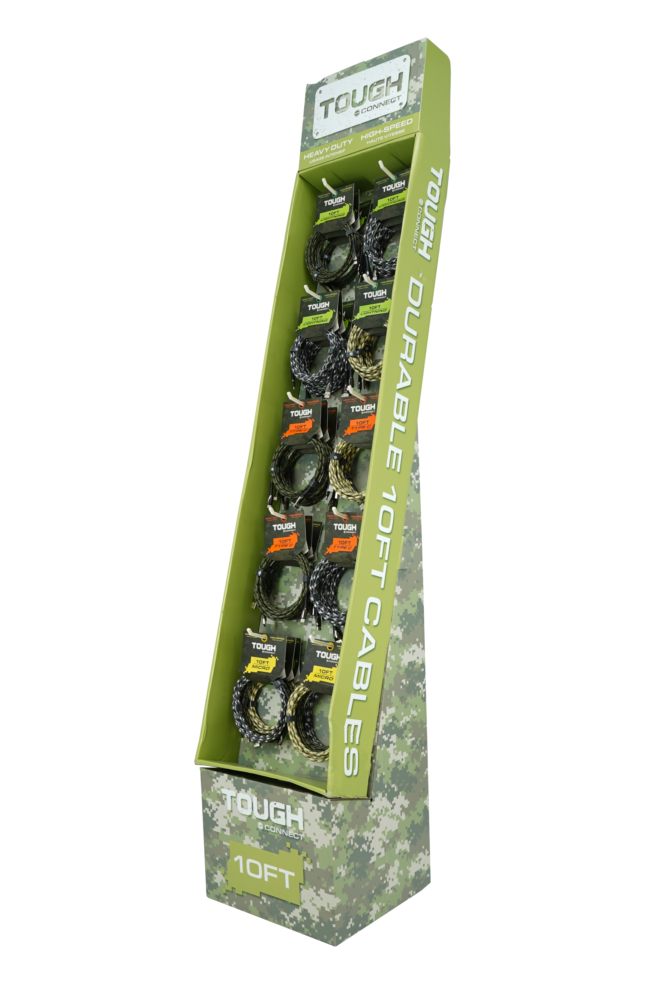 The Connect TOUGH cables required a standing display as well as corresponding tags to go on the products themselves. The metal ended design was developed to appeal to those working in blue collar jobs who need gear that is durable and matches with their equipment. The camouflage cables were made to appeal to hunters and those in the military, whereas the rubber and metal cables were made to appeal to those in the trades.